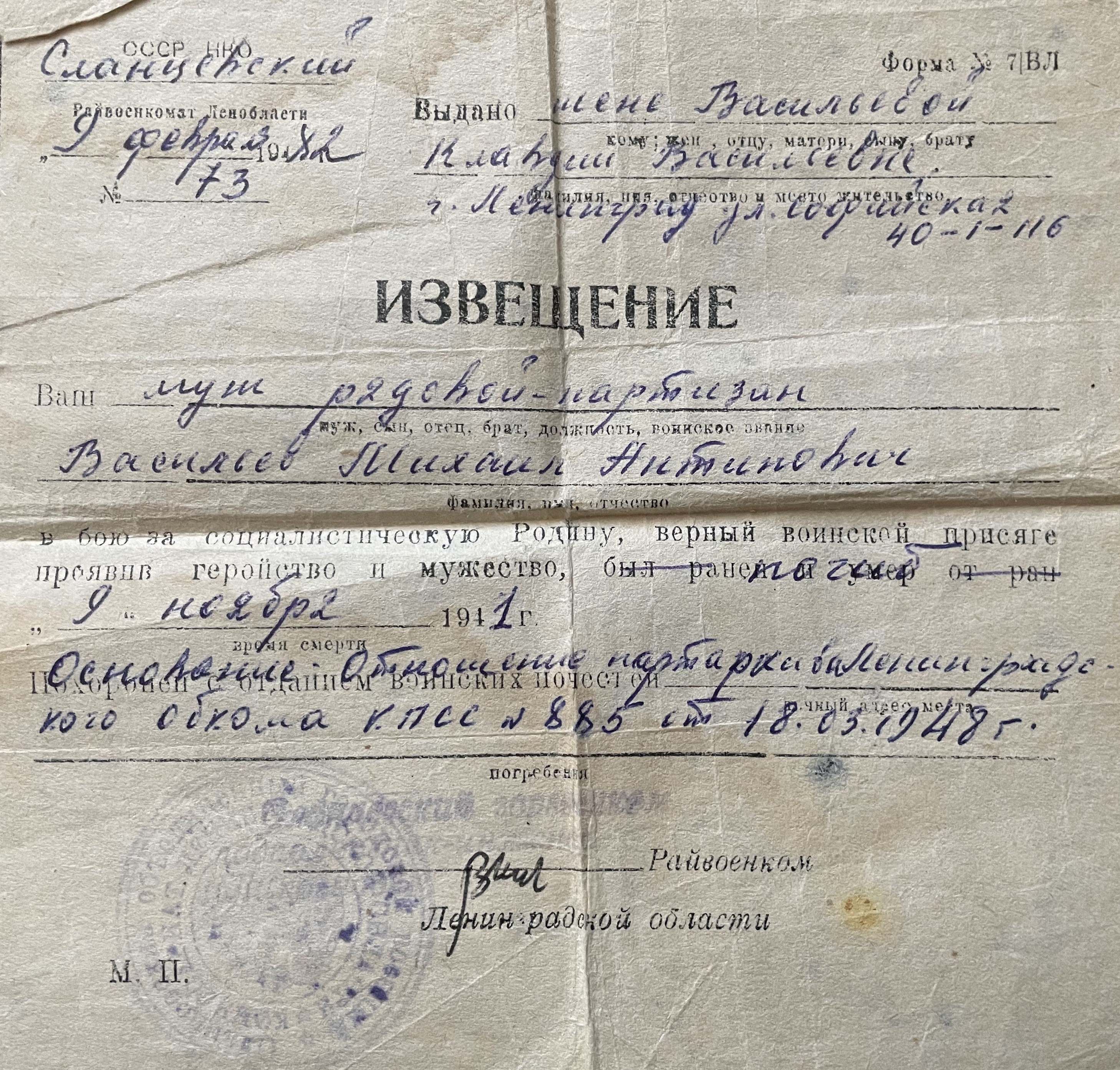 (документы предоставлены правнуком М.А. Васильева - Константином).